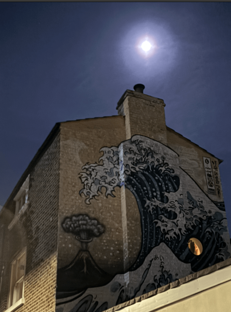 This poem was inspired by the confluence of two things, the first was a response a friend made to me when I was expressing my frustration with the manifestation of apocalypse and how it seemed so hard to thrive in these conditions: “We’ve got to learn to ride the wave.” The second thing was coming across the striking scene of this mural of The Great Wave off Kanagawa on the wall of a building in Denmark Hill (by Dominic Swords) with the full. moon overhead, seeming to ride the wave that it made…